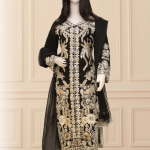 Carmine Eminence is the reflection of traditional yet luxury party wear. The beauty is enhanced with elegant handworh of Resham, Nahshi and Dapha as well as Sarozhi. The gold floral design on glamour red shirt is paired with gold Chech net dupatta and tissue gold trouser.